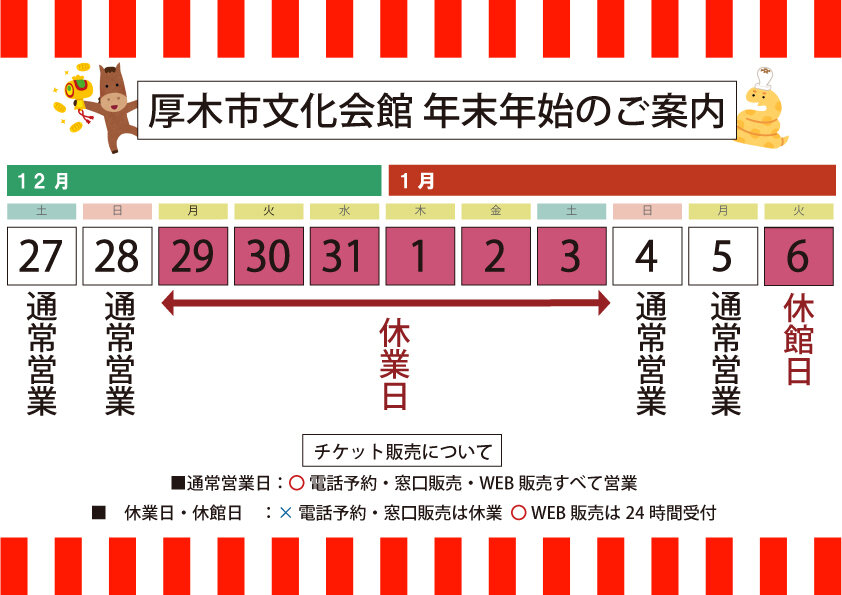 また、厚木市文化会館チケット予約センターの窓口及び電話受付もお休みです。WEB予約は24時間受付しておりますので、そちらをご利用ください。